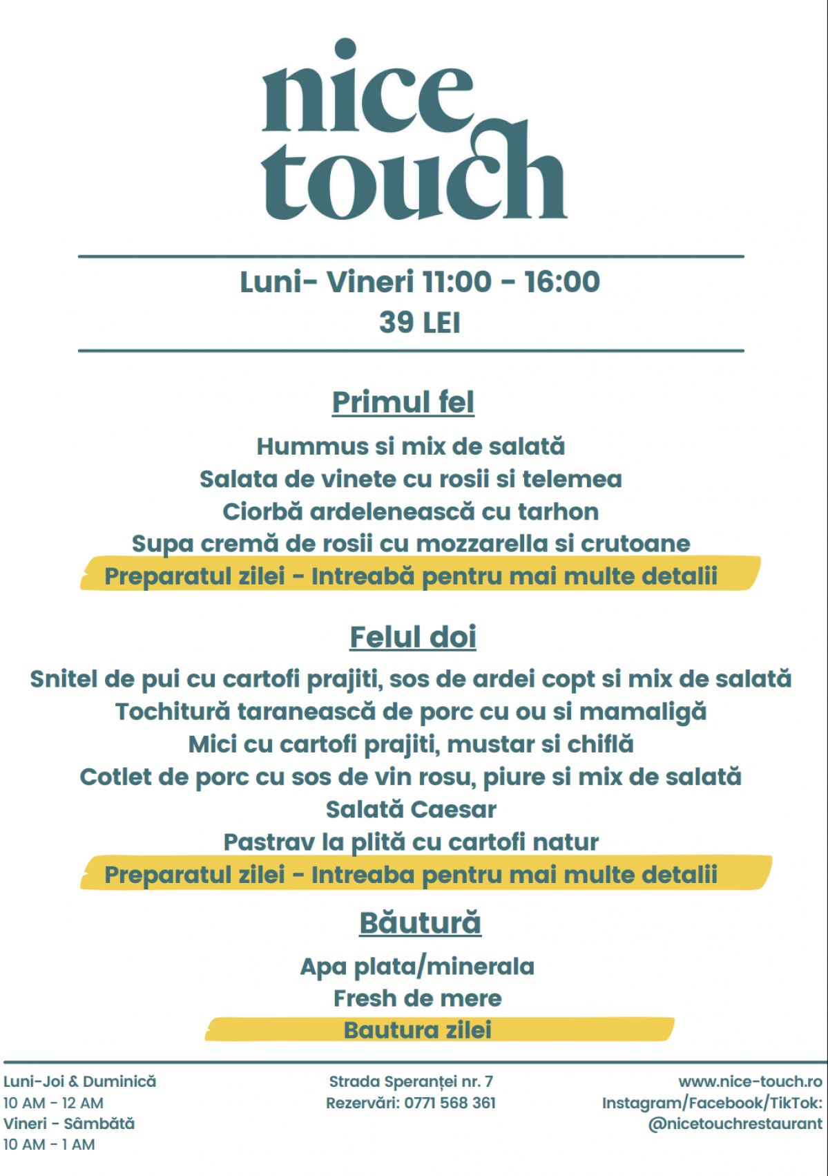 4,7 / 119 voturiLa Nice Touch te aÈ™teptăm cu paste, burgeri, preparate internaÈ›ionale, supe, salate fresh È™i deserturi savuroase, într-un local cu un interior cald È™i primitor È™i o terasă verde È™i relaxantă, unde poÈ›i lua masa în aer liber.